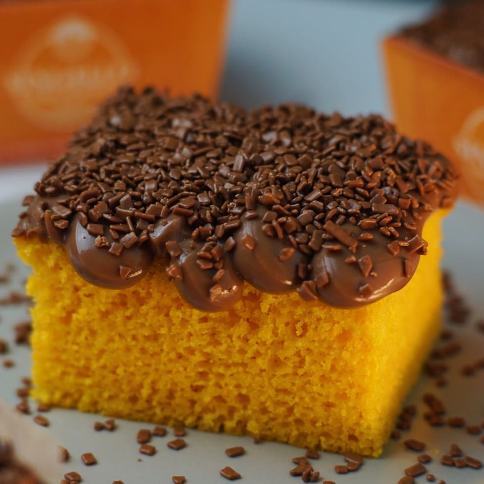 Bolo de cenoura bem fofinho coberto com brigadeiro cremoso e finalizado com granulados de chocolate ao leite. Aprox. 250g É aquele bolo perfeito para todos os momentos!