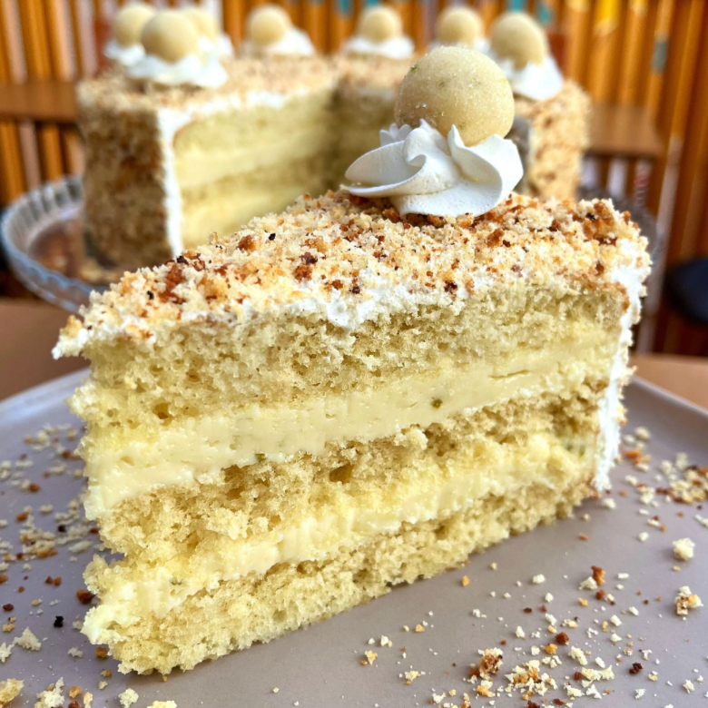 Deliciosa fatia de bolo feita com massa branca fofinha, recheio de três leites com limão, finalizado com uma fina camada de chantilly, farelinhos de bolo e um brigadeirinho de limão. Peso aprox. 220g (No delivery, a fatia acompanha o brigadeiro, mas sem a roseta de chantilly)