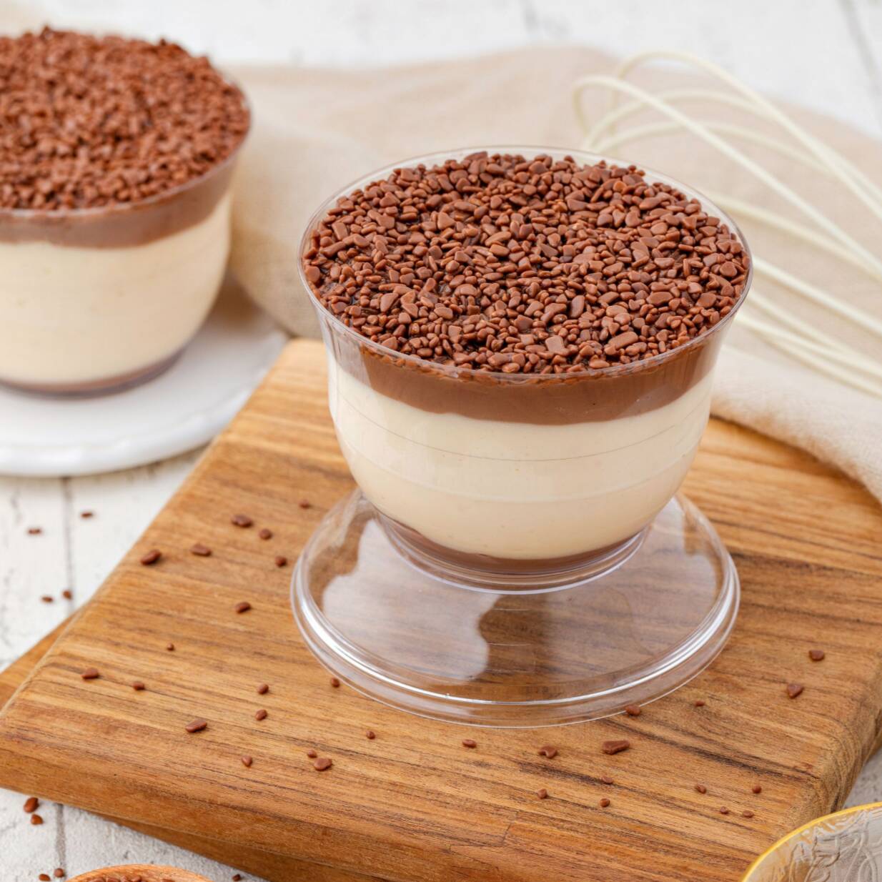 Mousse de maracujá com base e cobertura de brigadeiro cremoso, finalizado com granulados de chocolate ao leite (aprox. 170g).