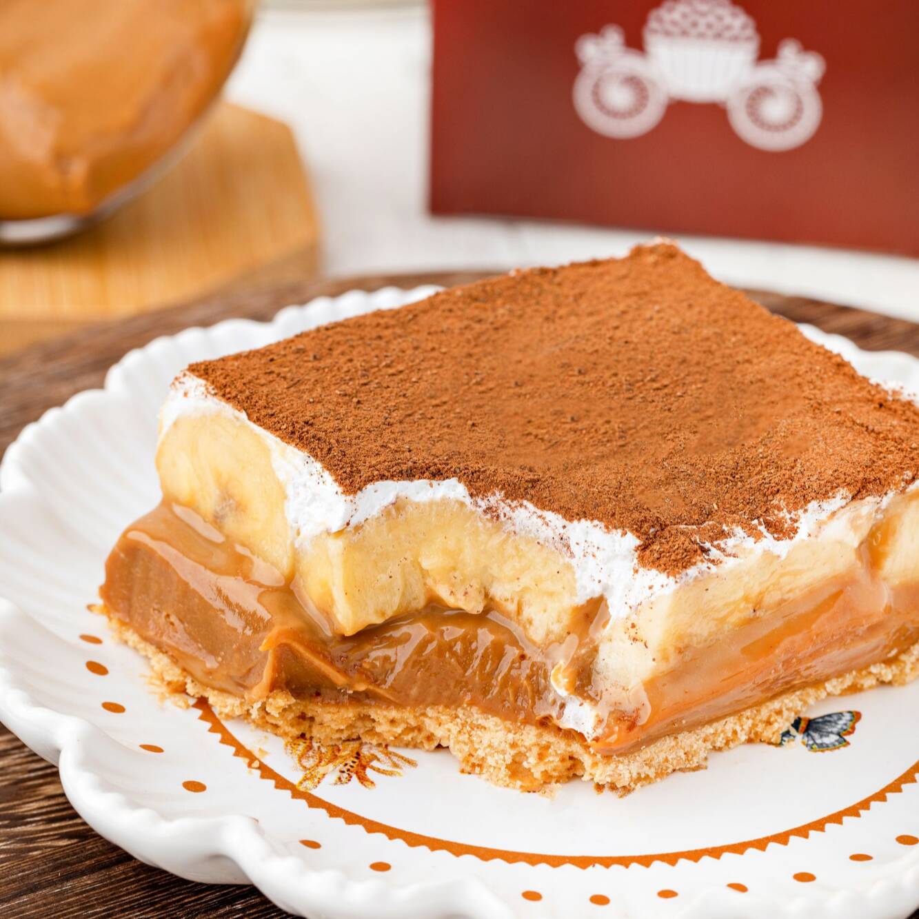 Massa de torta fininha, com doce de leite artesanal feito com Leite Moça, banana nanica, cobertura de chantilly e canela polvilhada para finalizar. Aprox. 150g