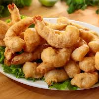 Camarões sem casca, empanados e fritos, dourados e crocantes, servidos com batata ou polenta frita e molho da casa, perfeito para quem aprecia sabor e qualidade.