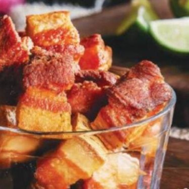 Panceta suína temperada e cortada em cubos, crocante e saborosa, perfeita para petiscar.