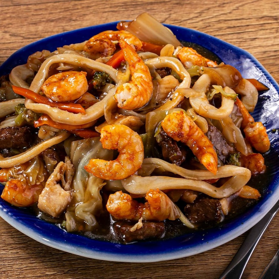 Nosso delicioso yakissoba com carne, frango e legumes ao molho de soja, para comer sozinho ou compartilhar com a galera. Aproveite!