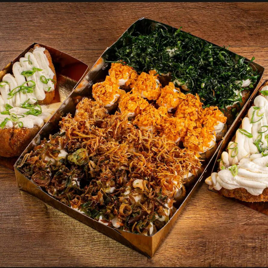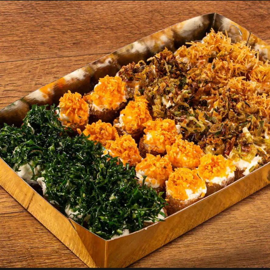 10 hot roll com couve crispy, 5 niguiri de salmão, 5 uramaki filadélfia com batata crispy