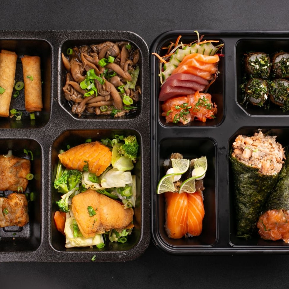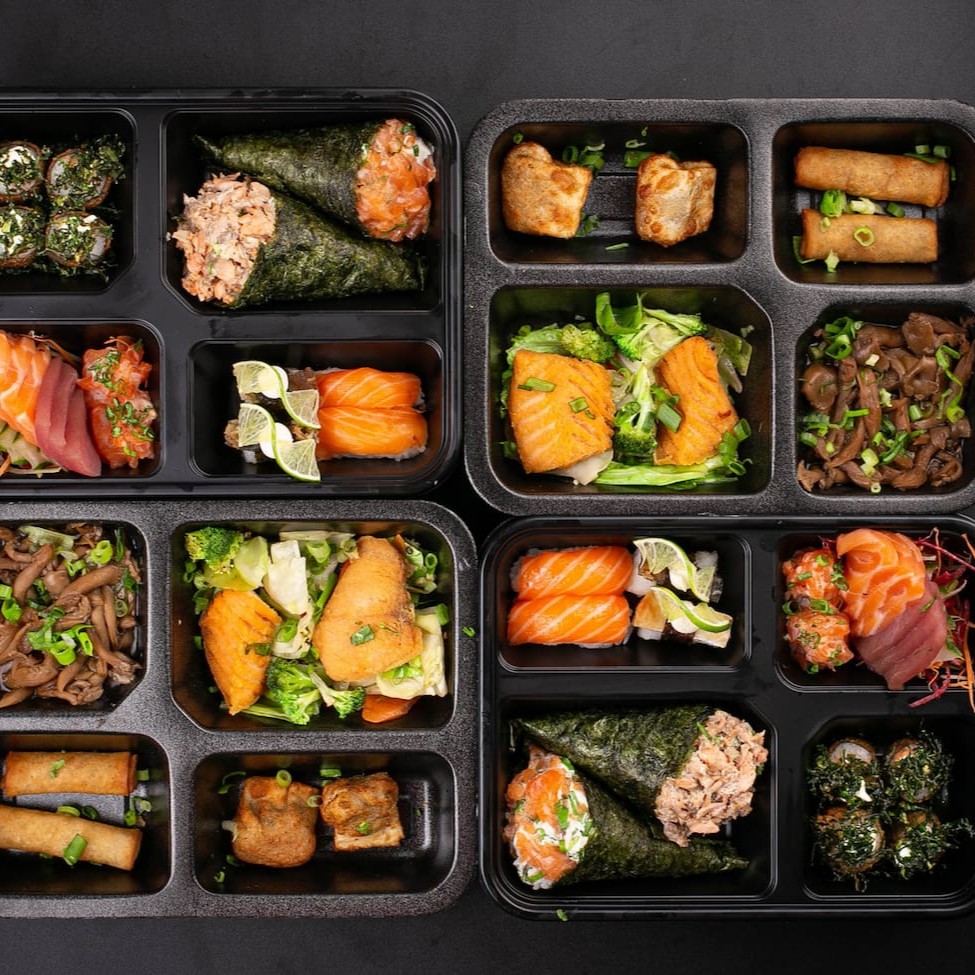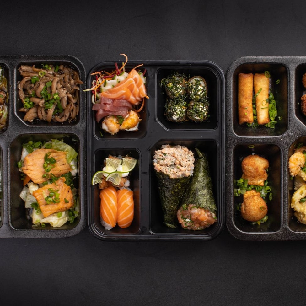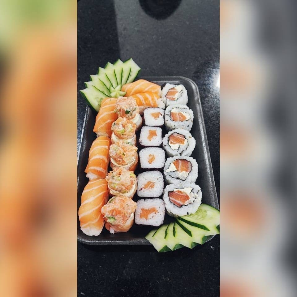 6 Sashimi 2 Jhous 2 niguiri skin 2 Niguiri salmão 4 Hot Hol 2 Temaki 100g a escolha do cliente 2 Guioza 2 Harumaki De Queijo 2 Salmões Grelhados com legumes 1 Shimeji 100g