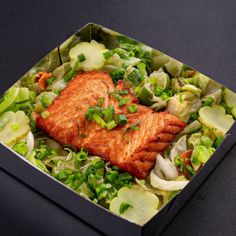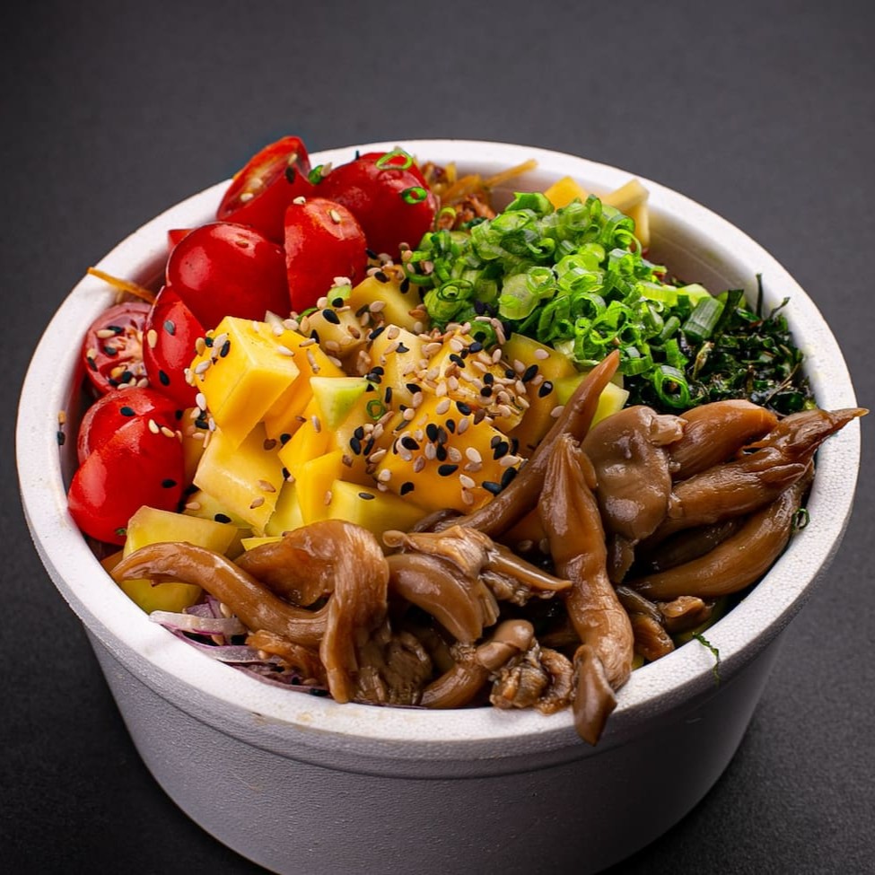 Shari (arroz japones), salmão grelhado, shimeji, manga, morango, tomate cereja, cebola roxa, batata crispy , couve crispty, alho poro ,cebolinha, cream cheese e gergilim . Não alteramos itens, caso queira retiramos algum item, somente.