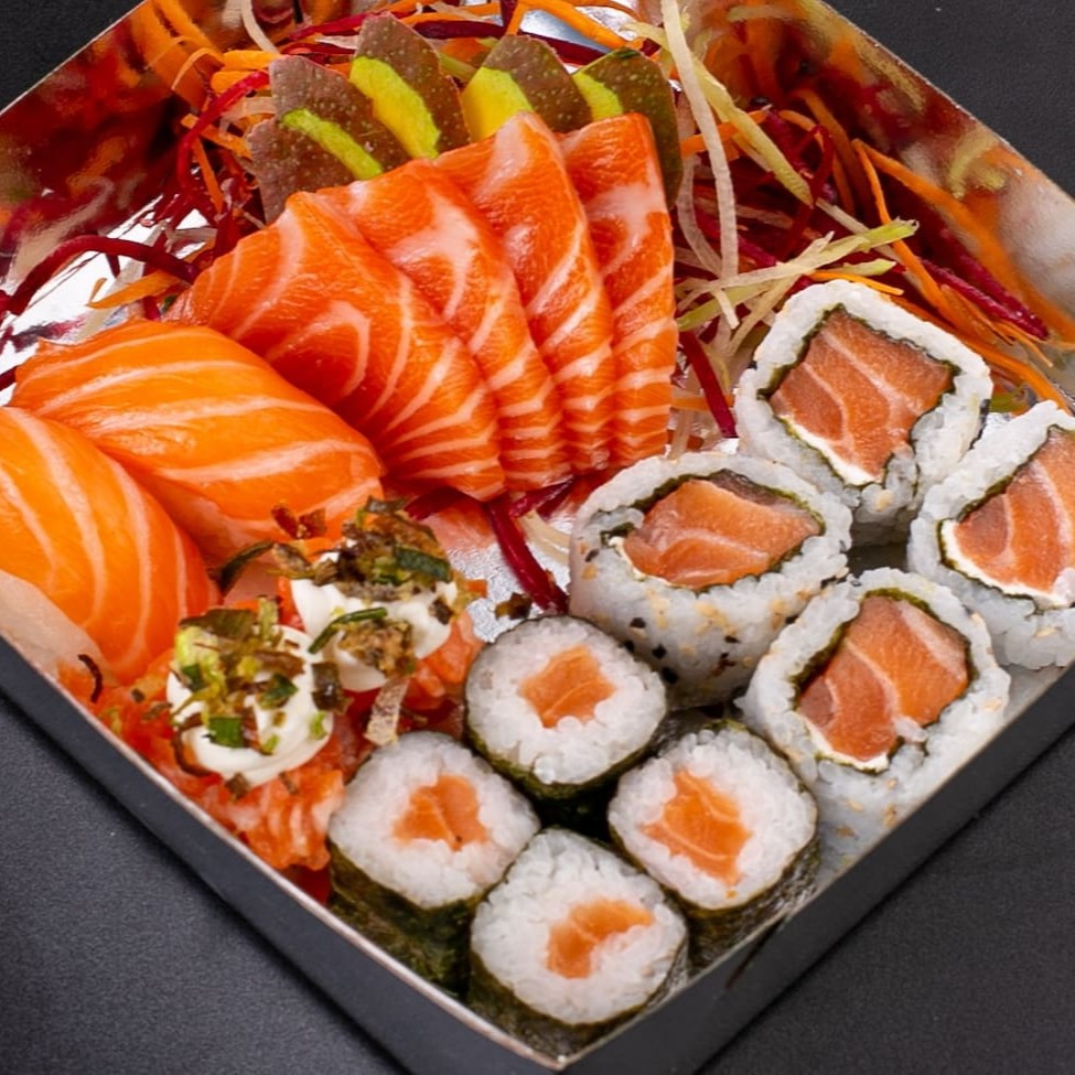 Combo composto por 5 Niguiri de salmão 5 salmonmaki 5 Jhon de salmão 5 uramaki de salmão itens não alterável