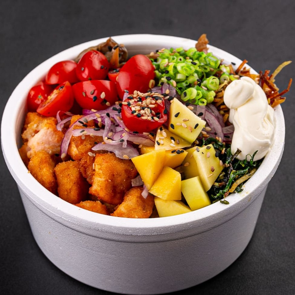 Shari (arroz japones), salmão em cubos, shimeji, manga, morango, tomate cereja, cebola roxa, batata crispy , couve crispty, alho poro ,cebolinha, cream cheese e gergilim . Não alteramos itens, caso queira retiramos algum item, somente.