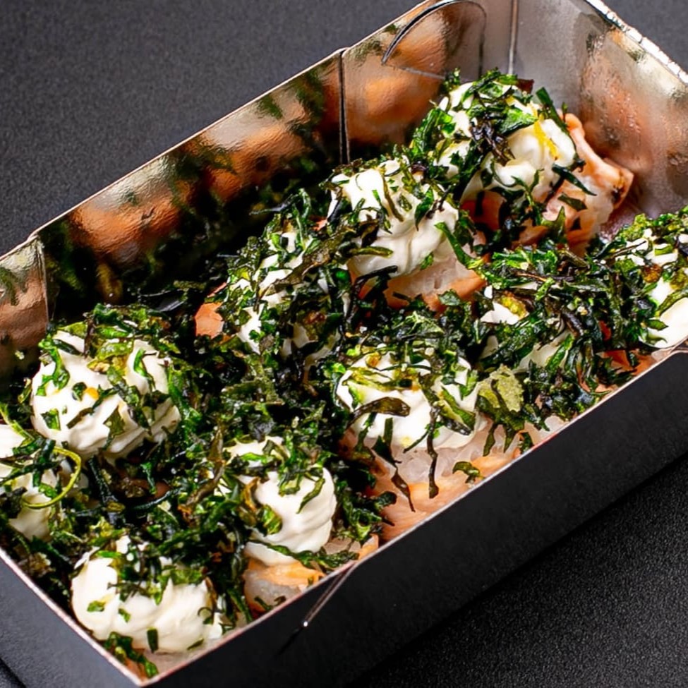 Este prato de '10 Jhou Salmão Maçaricado com Couve Crispy' é uma verdadeira obra-prima da culinária japonesa. Feito com pedaços generosos de salmão fresco e suculento, maçaricado à perfeição para realçar o seu sabor rico e profundo. Acompanha cream cheese cremoso e suave, acrescentando uma textura única e equilibrando a riqueza do peixe. O arroz shari, cozido na perfeição e delicadamente temperado, serve como base perfeita para este prato. Finalizado com toques de couve crispy, adicionando um contraste crocante ao prato. Cada mordida deste elegante uramaki e hossomaki é uma explosão de sabores inesquecíveis.