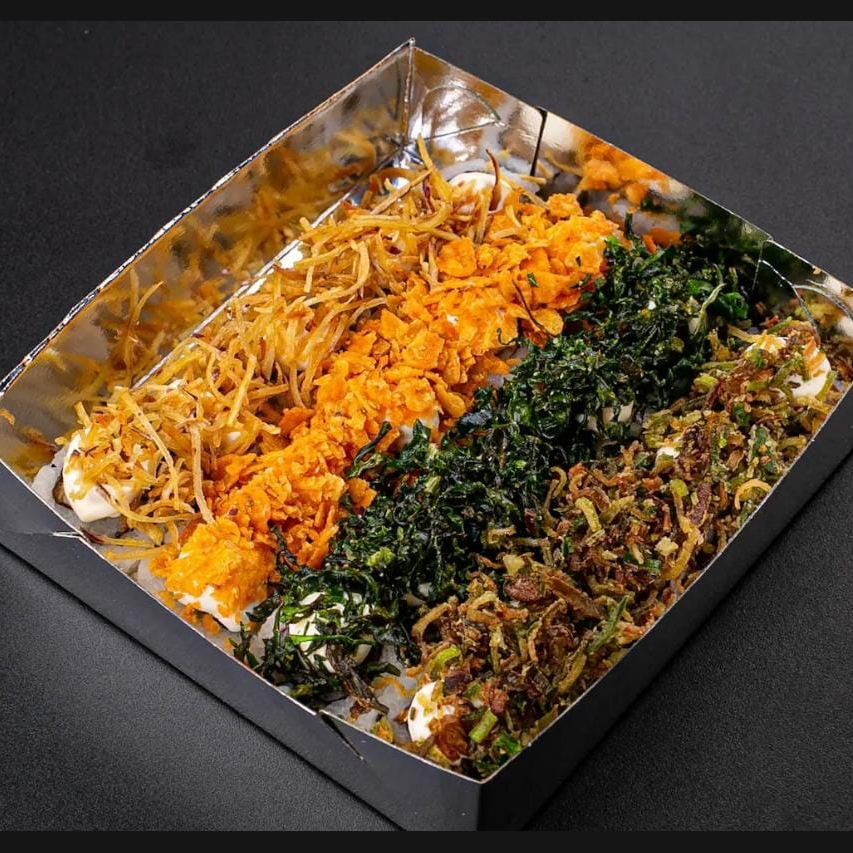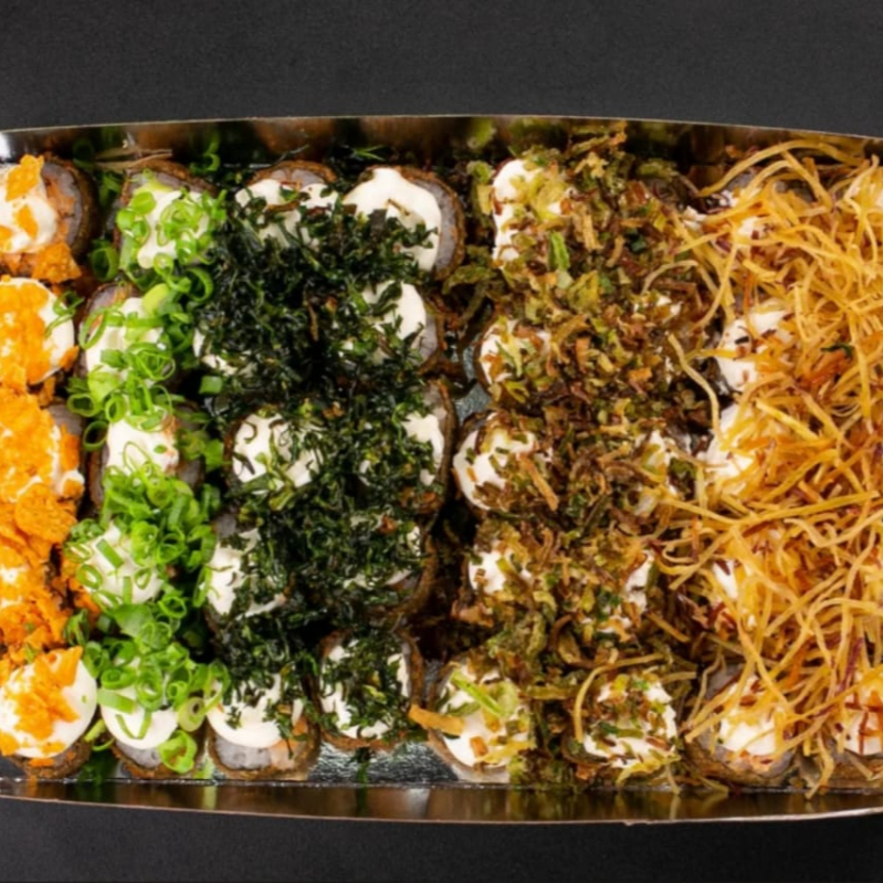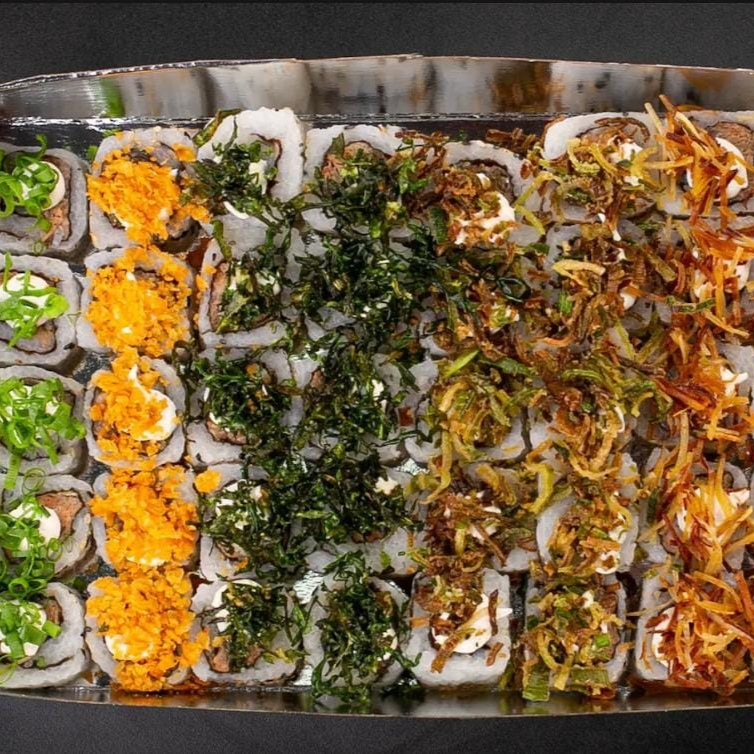 5 uramaki com Doritos, 5 uramaki com couve crispy, 5 uramaki com batata crispy, 5 uramaki com cream cheese e cebolinha