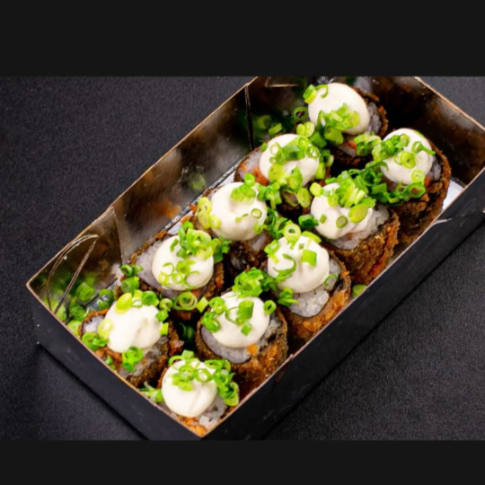 Hot Roll Premium Sushi preparado com arroz (shari), recheado com salmão e cream cheese. Servido frito com cebolinha. TARE ENVIADO A PARTE.