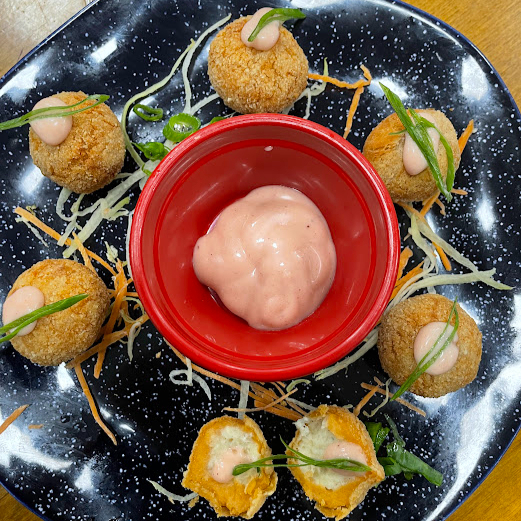 hot holl empanado feito com alga inteira , recheio de salmao em cubos com cream cheese ,cebolinha e tare