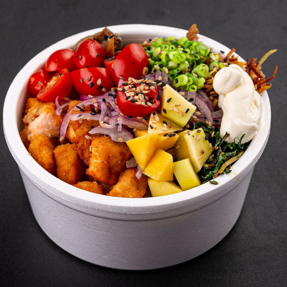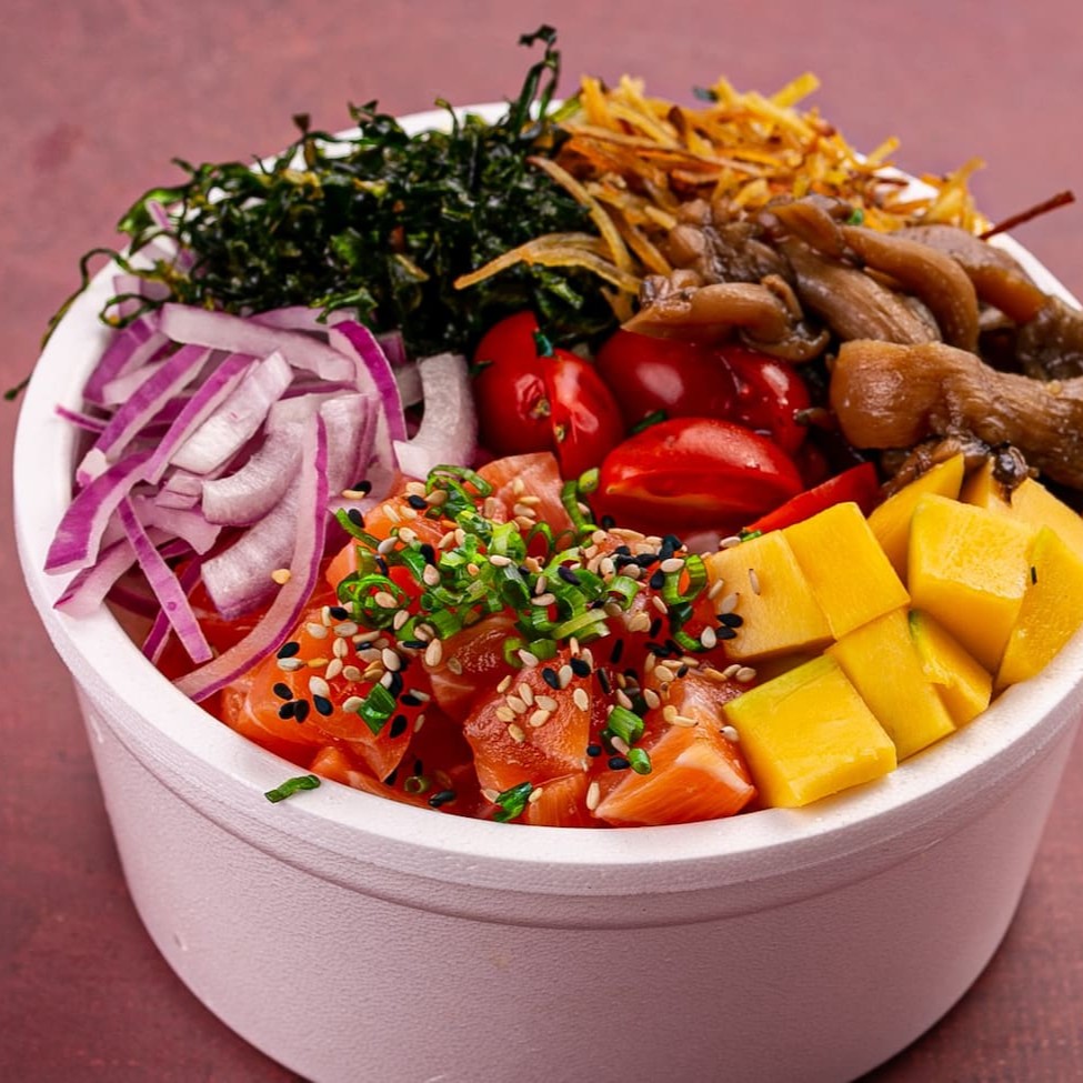 Arroz,salmão em cubos,shimeji,sunomonu,manga,tomate cereja,cebola roxa,batata frita,couve frita,cebolinha,,cream cheese,genilim. Não alteramos itens.