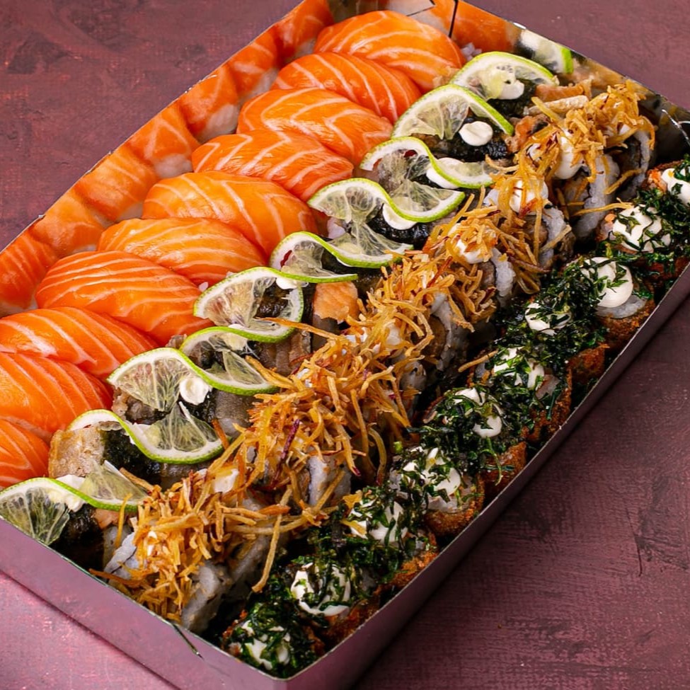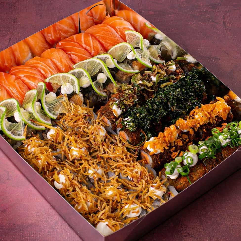 20 salmomaki, 20 hot holl com couve crispy, 20 uramaki filadelfia com batata crispy, 20 kanimaki, 20 uramaki de salmão, 16 sashimi de salmão