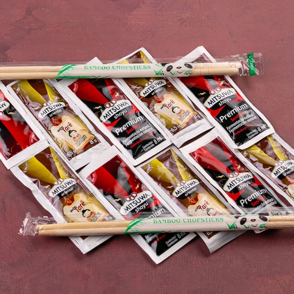 Kit com 5 shoyu + 5 tarê + 2 hashi