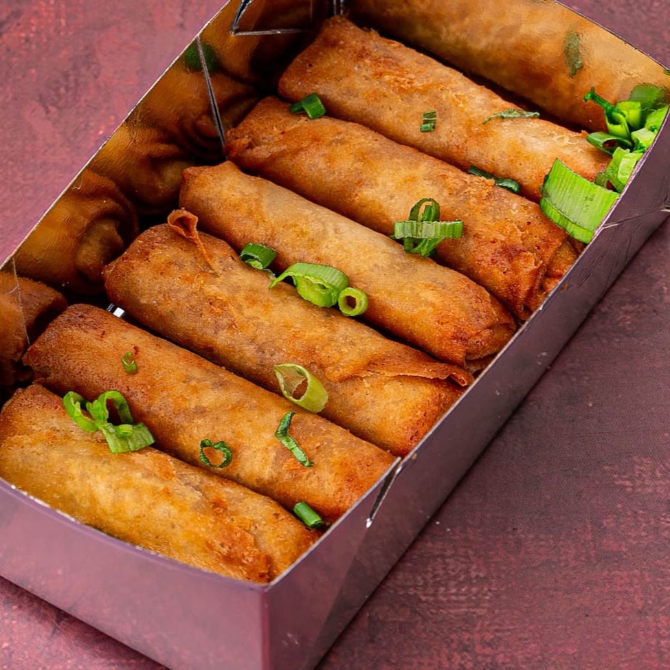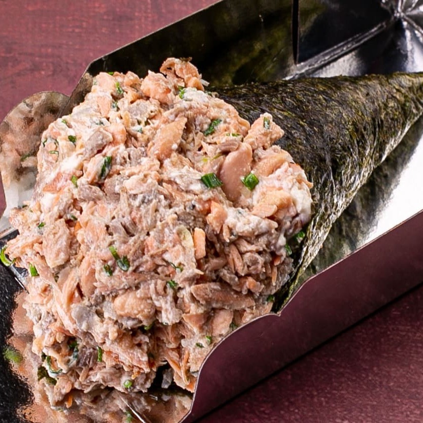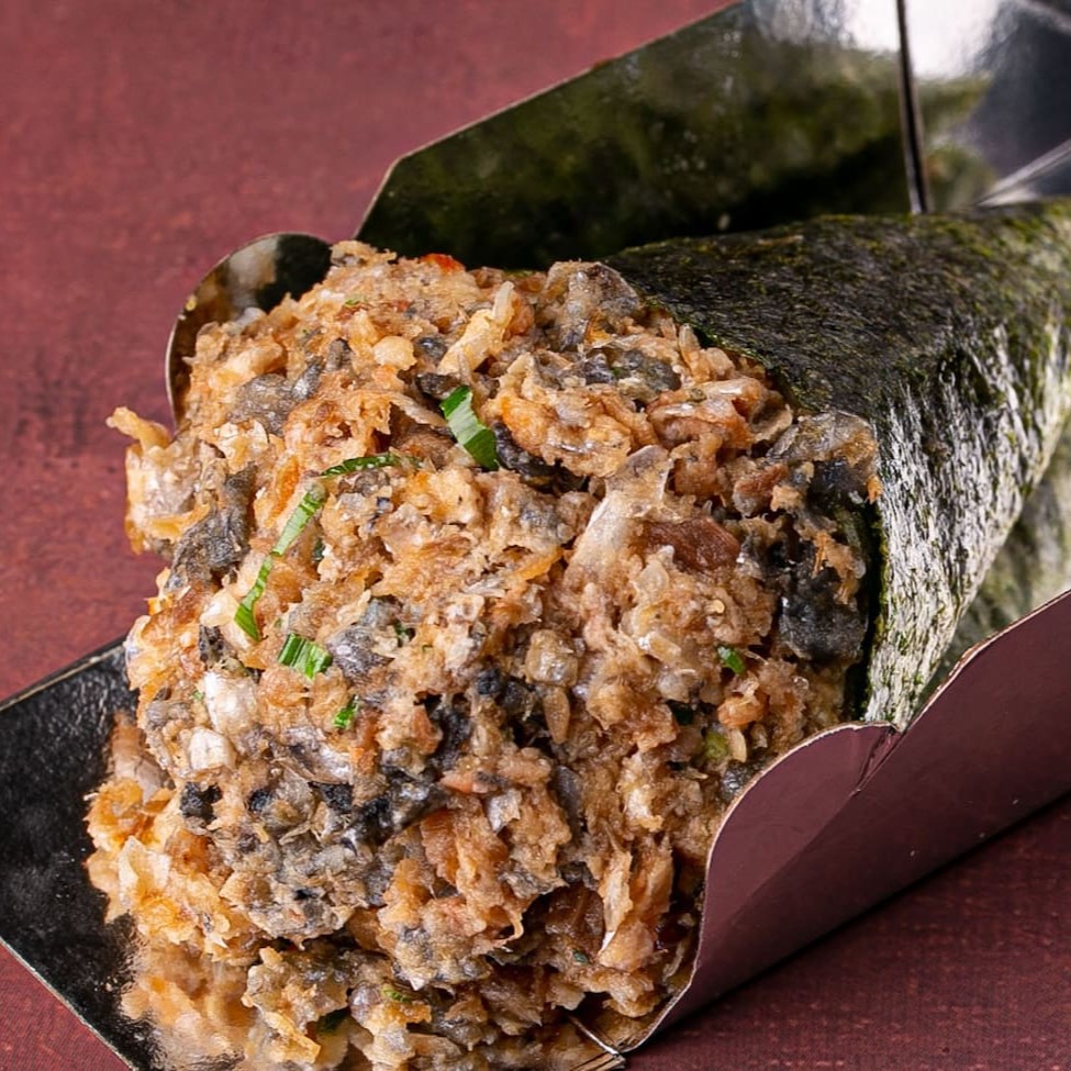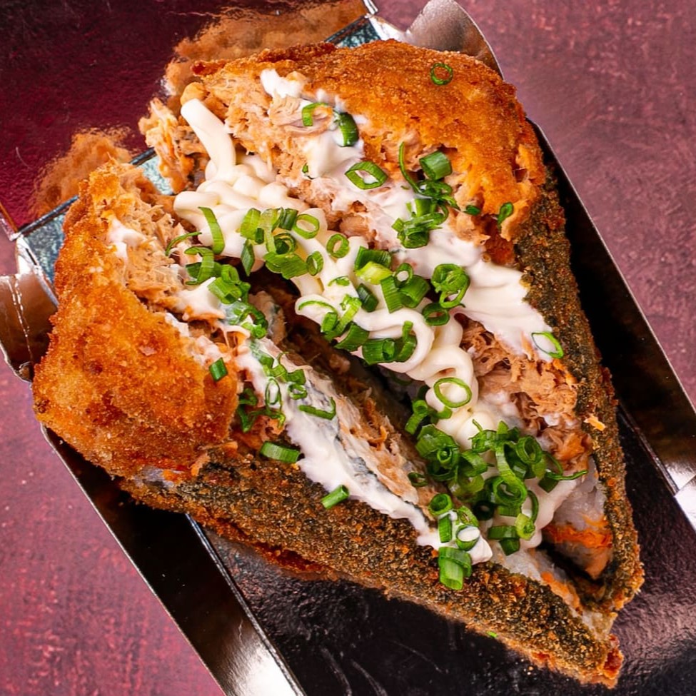 hot holl empanado feito com alga inteira , recheio de salmao em cubos com cream cheese ,cebolinha e tare