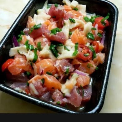 Peixe prego, Salmão, atum, cebola roxa, tomate cereja, limão e hondashi