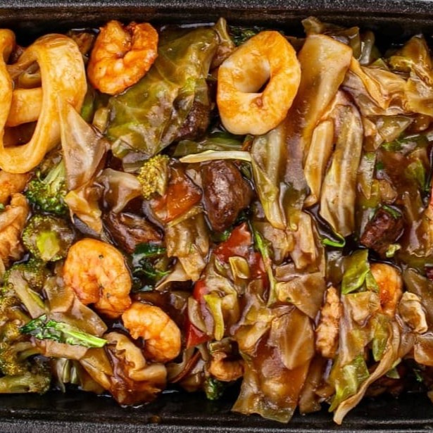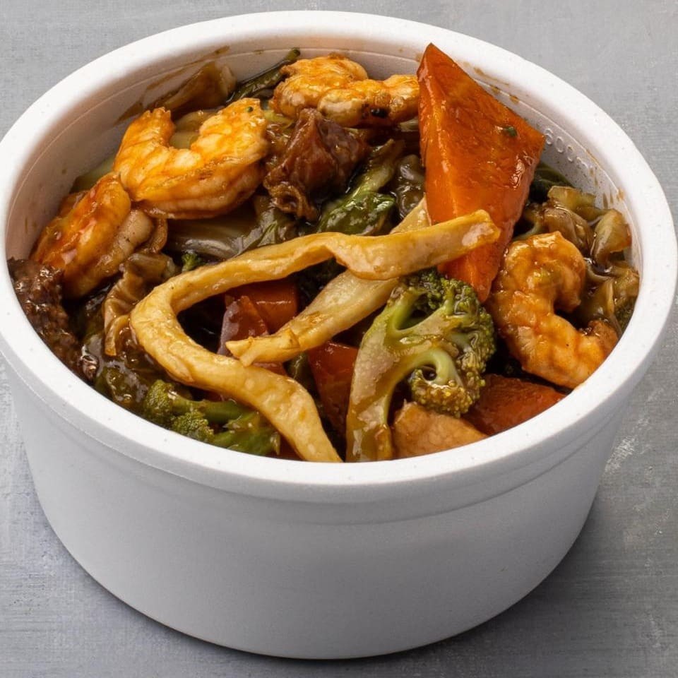 Macarrão, Carne Bovina, Frango,Lula,Camarão, Legumes e Molho.
