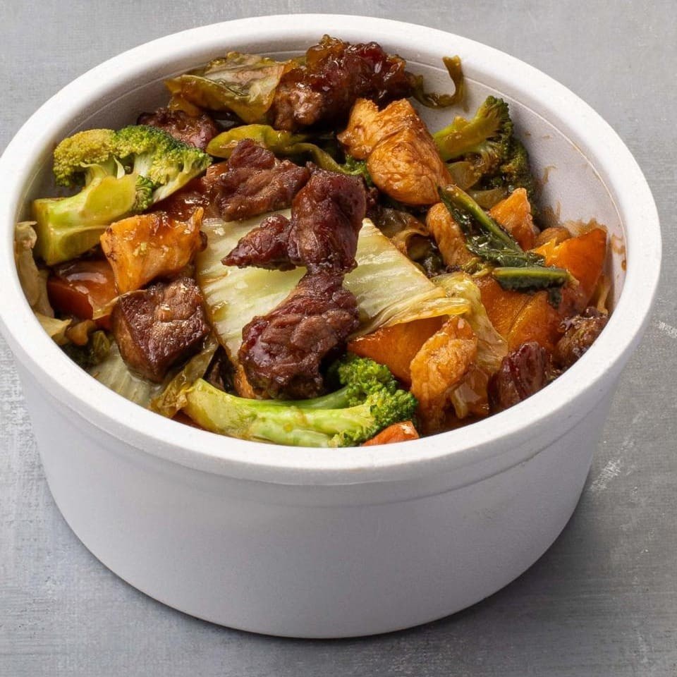 Macarrão, Carne Bovina, Frango, Legumes e Molho.