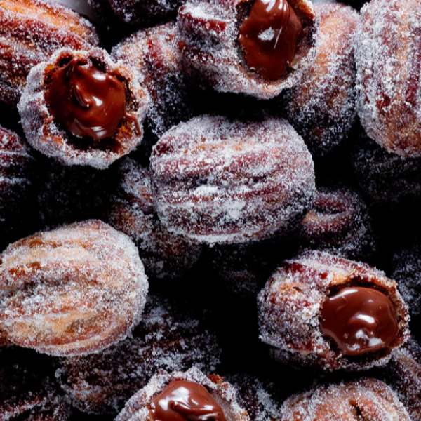 Massa produzida com cacau 50% com um recheio super cremoso de chocolate,finalizado com canela e açúcar! Crocante por fora e cremoso por dentro