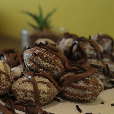Massa produzida com cacau 50% recheda com um recheio super cremoso de chocolate ,finalizado com canela e acucar ! Cronte por fora e cremoso por dentro