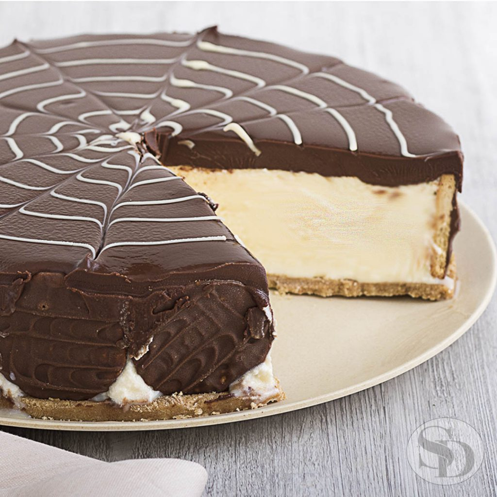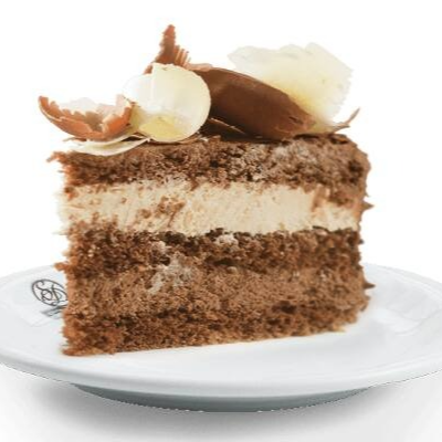 Uma verdadeira viagem aos Alpes Suíços em cada mordida. Bolo de chocolate sem açúcar com recheio de trufado de chocolate e mousse branca com cobertura de mousse branca e calda de chocolate.