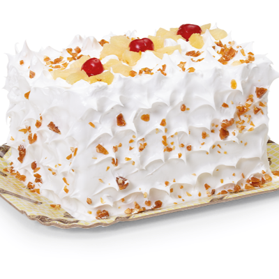Não perca a chance de experimentar nosso bolo de massa branca com recheio irresistível de mousse branca com abacaxi e cocada, coberto com um marshmallow suave e coco ralado, finalizado com cerejas decorativas. Cada fatia é uma mistura perfeita de sabores. Faça sua encomenda agora mesmo!