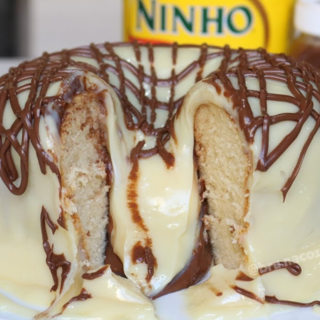 Bolo de massa branca,recheio de brigadeiro de leite em pó Ninho e creme de Nutella com cobertura de leite em pó Ninho