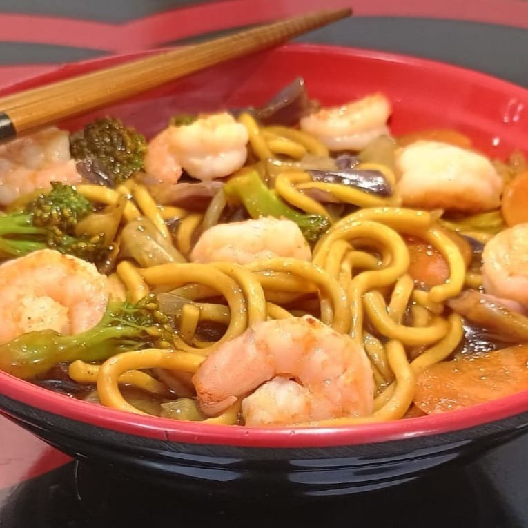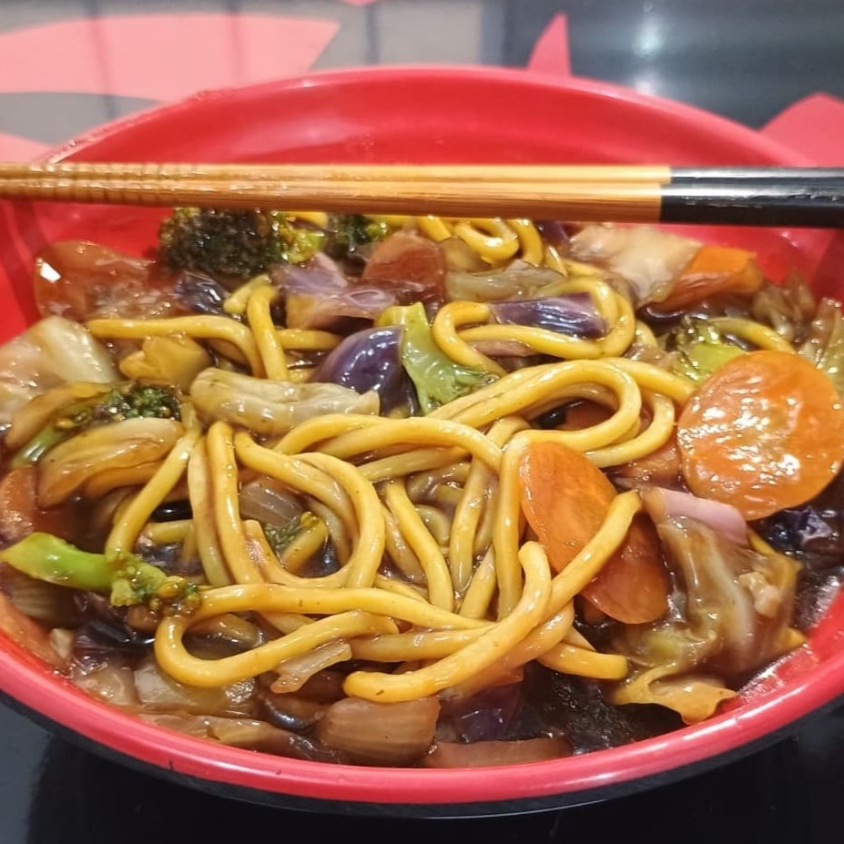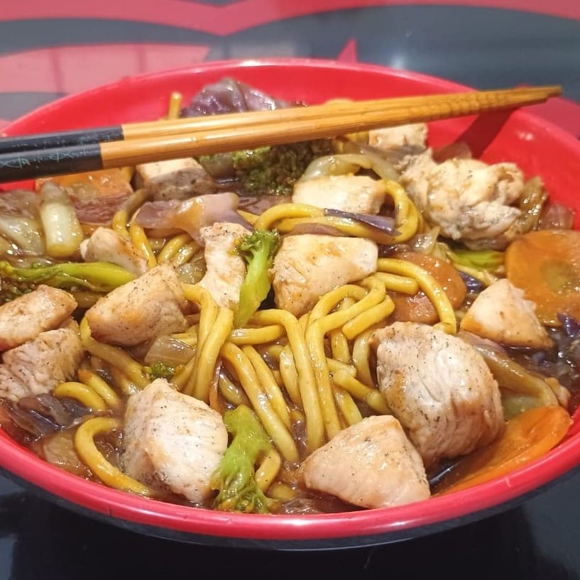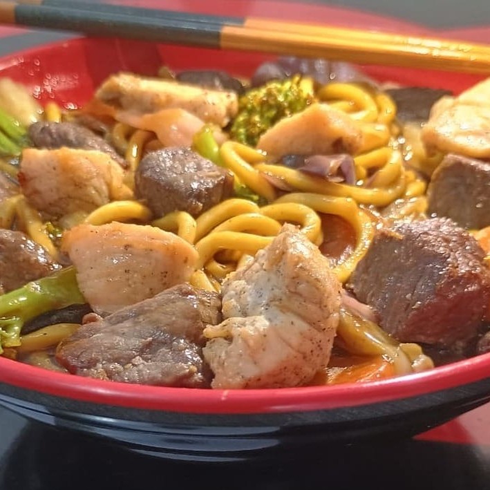 Delicioso yakisoba feito com macarrão oriental, molho da casa à base de shoyo e gengibre, filé de frango e carne bovina em cubinhos, cenoura, repolho, brócolis, cebolinha e cebola. (Acompanha 1 sache de molho shoyo e um par de hashi)