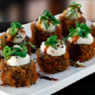Mini sushi com recheio de salmão, empanado com farinha panko e frito, cobertura de tarê e o topo salpicado de cebolinha e gergelim. (Acompanha hashi + 1 sache de molho shoyo + 1 sache de tarê)