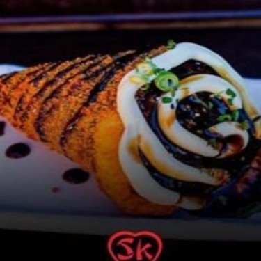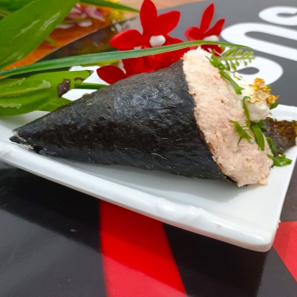 Delicioso cone feito com nori (alga) arroz oriental, salmão grelhado e cream cheese. Empanado com farinha panko e frito, sua finalização é feita com o temaki aberto, com cobertura de tarê e couve crispy. (Acompanha 1 sache de molho shoyo + 1 sache de tarê)