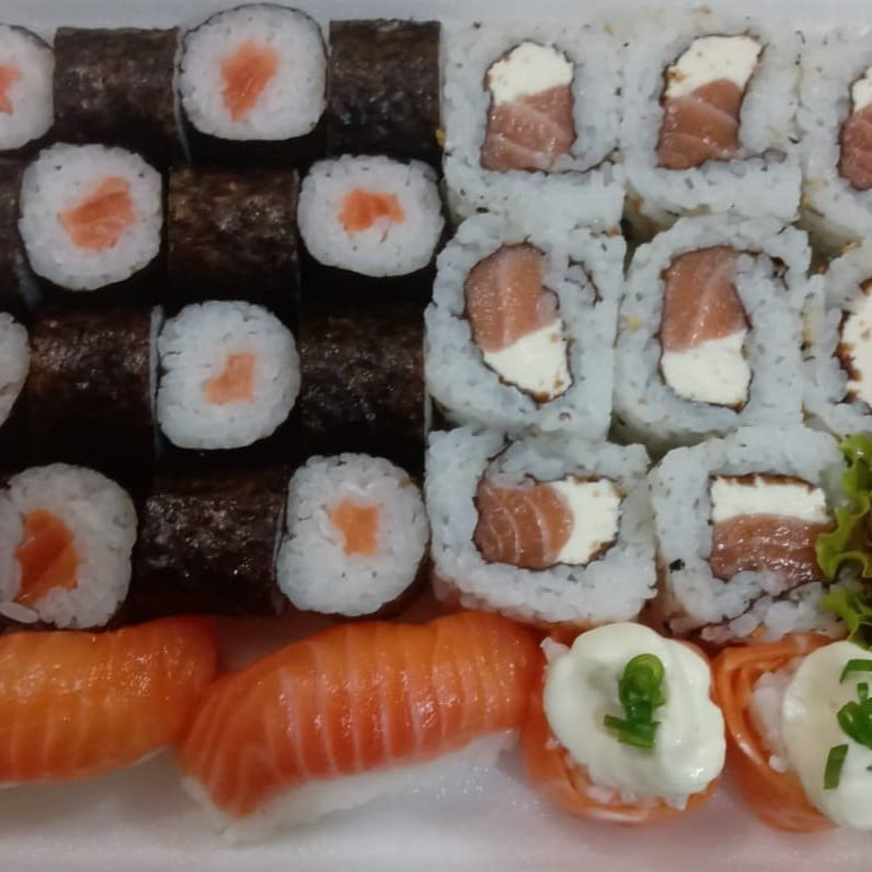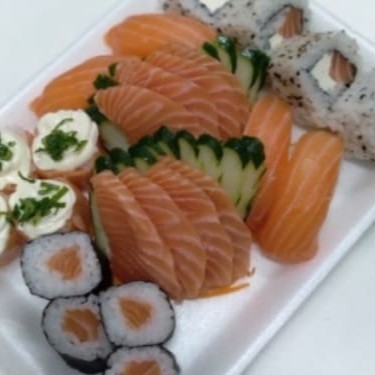 Delicioso combinado composto por: 8 peças de sashimi, 4 peças de joe, 4 peças de niguiri, 4 peças de uramaki e 4 peças de hossomaki - tudo de salmão. (Acompanha 2 pares de hashi + 2 saches de shoyo + 2 saches de tarê)