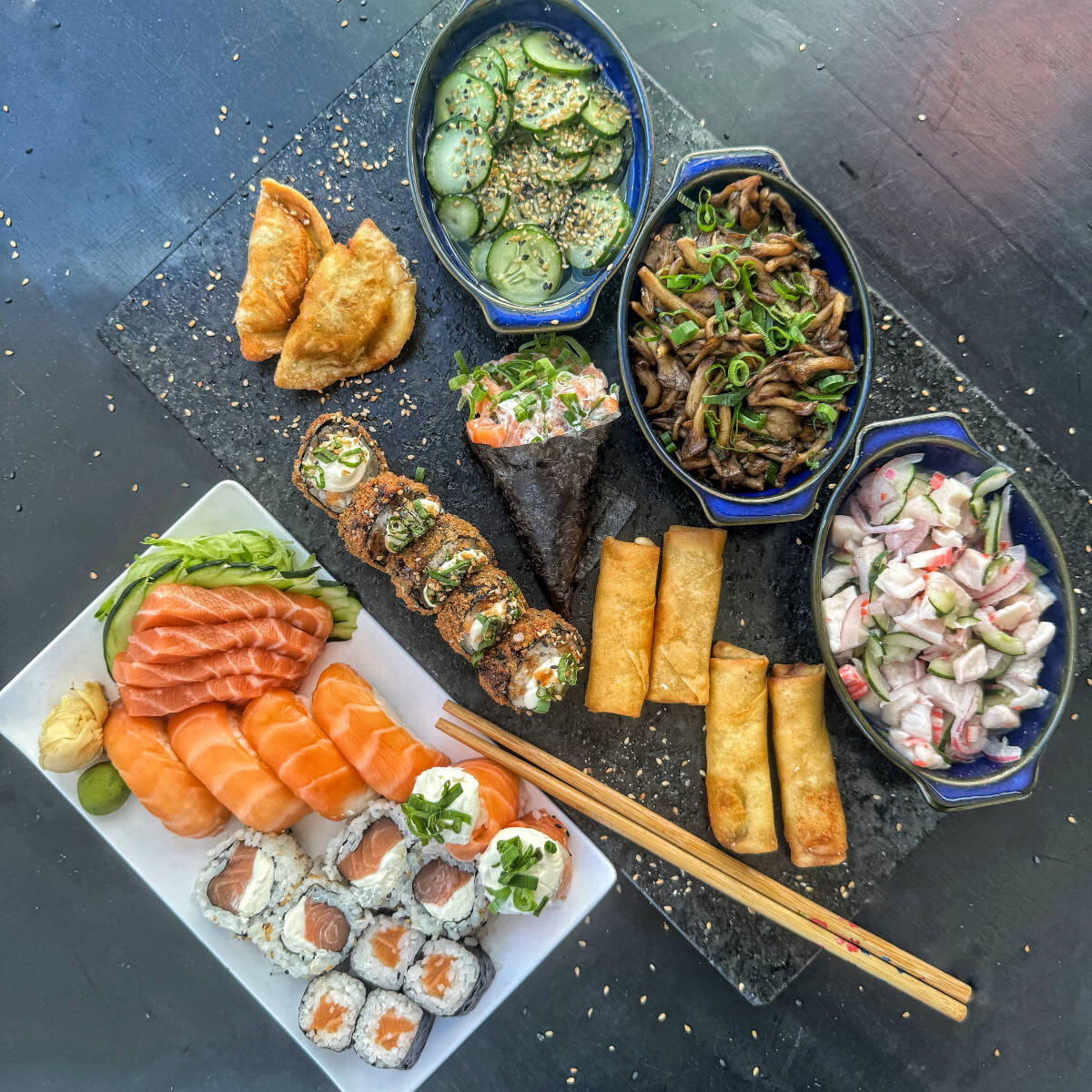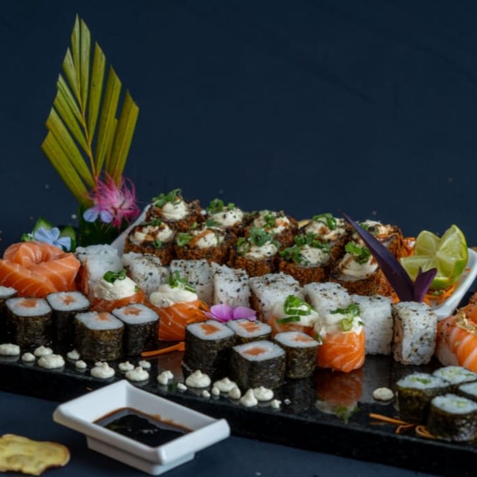 Combinado contendo:1 mini temaki + 5 peças de hot roll + ceviche (100g) + sunomono (100g) + shimeji (100g) + 2 harumaki de queijo + 2 guioza + 4 niguiri salmão + 4 sashimi salmão + 2 joe (salmão com cream cheese) + 4 hossomaki salmão + 4 uramaki salmão + 2 harumaki de chocolate **não é possivel trocar nenhum item** (Acompanha 1 par de hashi + 2 saches de molho shoyo + 2 saches de tarê)