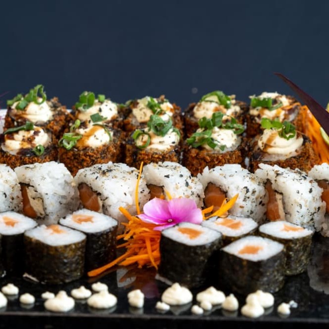 4 peças de niguiri, 4 peças de joe, 4 peças de sashimi, 8 peças de hossomaki salmão, 8 peças de hossomaki kani, 8 peças de uramaki e 10 peças de hot roll (Acompanha 2 hashis + 2 saches de molho shoyo + 2 saches de tarê)