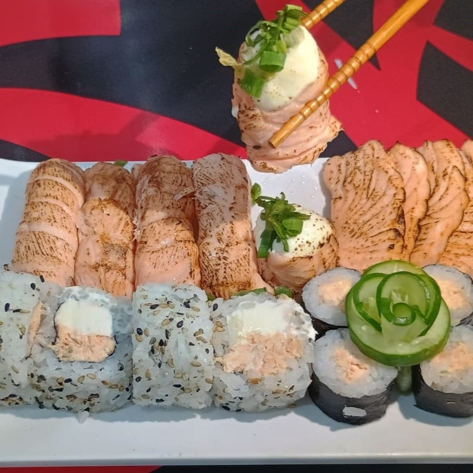 8 peças de uramaki (salmão grelhado), 8 peças de hossomaki (salmão grelhado),10 peças de hot roll (salmão grelhado) (Acompanha 2 pares de hashi + 2 saches de molho shoyo + 2 saches de tarê)