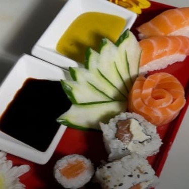 2 peças de uramaki (salmão), 2 peças de hossomaki (salmão), 2 sashimi(salmão) e 2 peças de niguiri (salmão) (Acompanha hashi + 1 sache de molho shoyo + 1 sache de tarê)