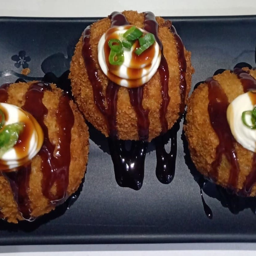 Surpreenda-se com esse maravilhoso bolinho feito da mistura do arroz oriental, cebola, tempero especial e salmão, coberto com cream cheese e cebolinha (empanado com farinha panko e frito) (Acompanha 2 saches de molho shoyo + 2 saches de tarê)