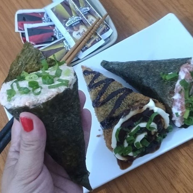 3 Mini Temaki de 100g cada com recheio a sua escolha. Acompanha 1 sache de shoyo + 1 sache de tare.