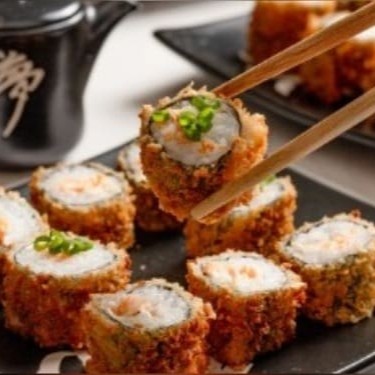 Delicioso hot roll feito com salmão grelhado, arroz oriental e cream cheese envolto por nori, empanado com farinha panko e frito, coberto por cream cheese, tarê e gergelin. (Acompanha hashi + 1 sache de molho shoyo + 1 sache de tarê)