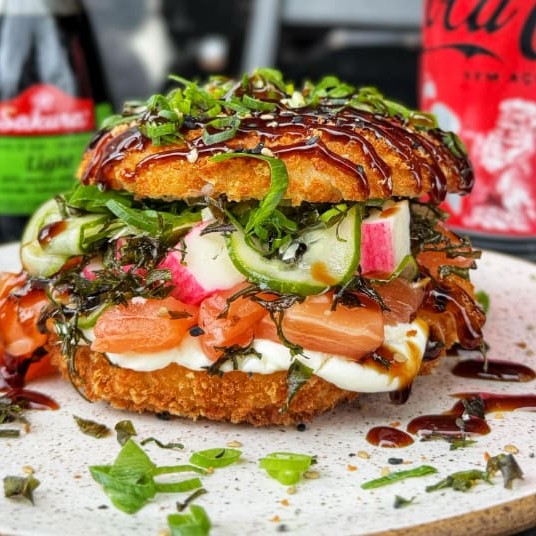 Nosso hamburger de sushi é feito com shari (arroz japones temperado) empanado e frito, salmão grelhado, pepino japones, kani, couve crispy e cream cheese. Para fianlizar é salpicado com cebolinha e coberto com tarê. Acompanha 1 sache de shoyo + 1 sache de tare