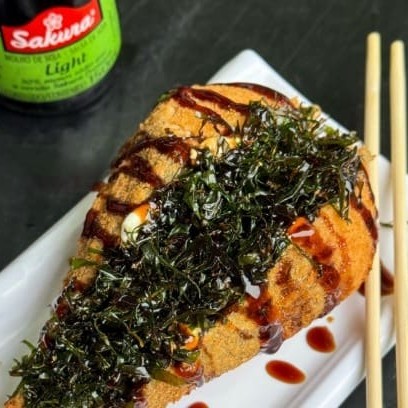 Delicioso hot roll no formato de hot dog composto por salmão grelhado, arroz oriental e cream cheese envolto por nori, empanado com farinha panko e frito, por fim coberto com tarê e gergelim. (1 sache de molho shoyo + 1 sache de tarê)