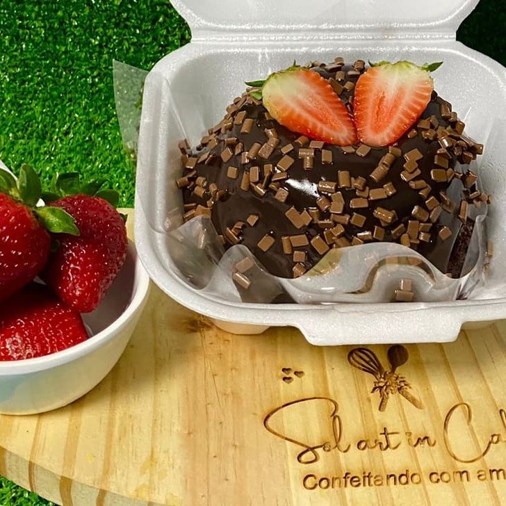 Apresentamos o nosso 'Bolo Vulcão Caseirinho Sensação'. Esta delícia caseira é cuidadosamente elaborada com uma massa de chocolate aveludada e extremamente fofa, recheada no seu centro com uma autêntica geleia de morango artesanal. A cobertura é uma irresistível calda cremosa de brigadeiro blend que se funde harmoniosamente com o recheio. Para finalizar, o bolo é decorado com morango fresco in na