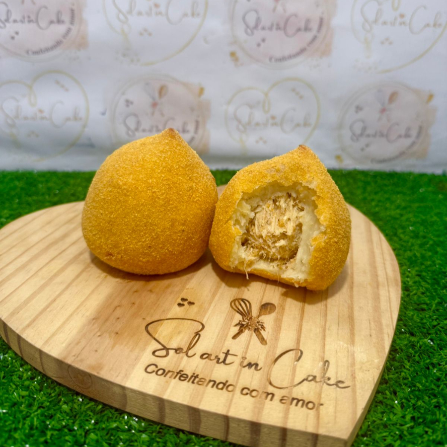 """Nossa Coxinha é feita com uma massa macia e textura crocante, recheada com frango suculento e bem temperado, realçada pelo sabor autêntico do Catupiry Original. Prepare-se para uma verdadeira explosão de sabor a cada mordida!"""