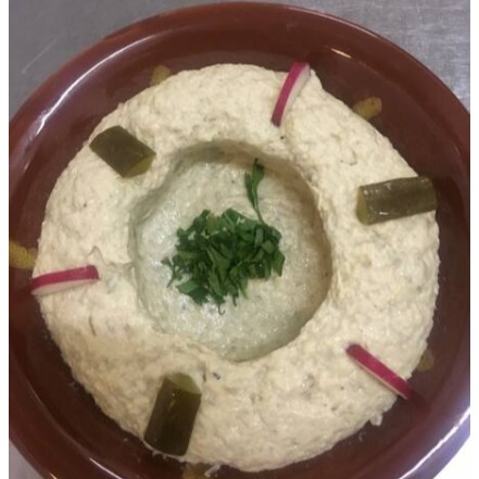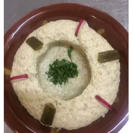Pasta de grão de bico cozido temperado com logo de gergielim ( tahine) suco de limão e sal.