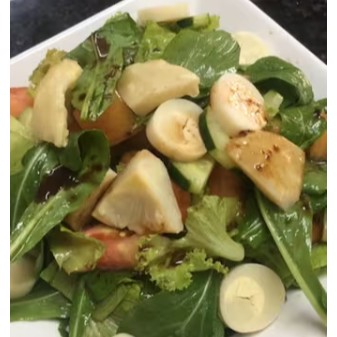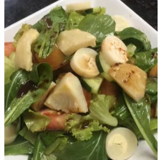 Rúcula, tomate, pepino, palmito,alface, temperada com molho de roma, sal e azeite.