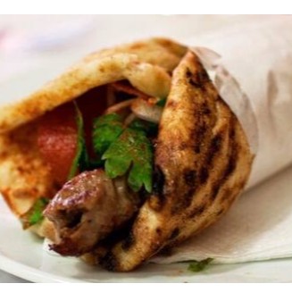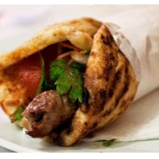 Cafta de carneiro assada enrolada no pão sírio com pasta de grão de bico (homus) pepino em conserva cebola e salsinha. Serve 1 pessoa