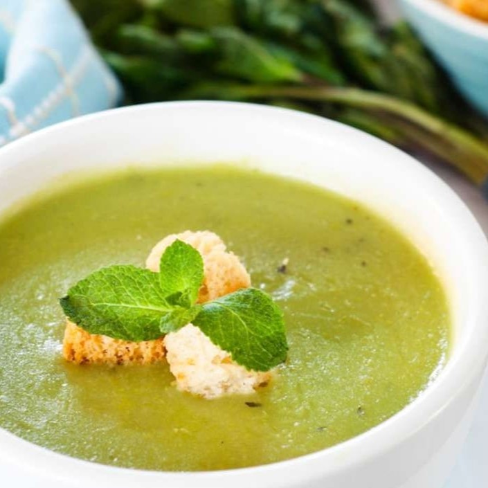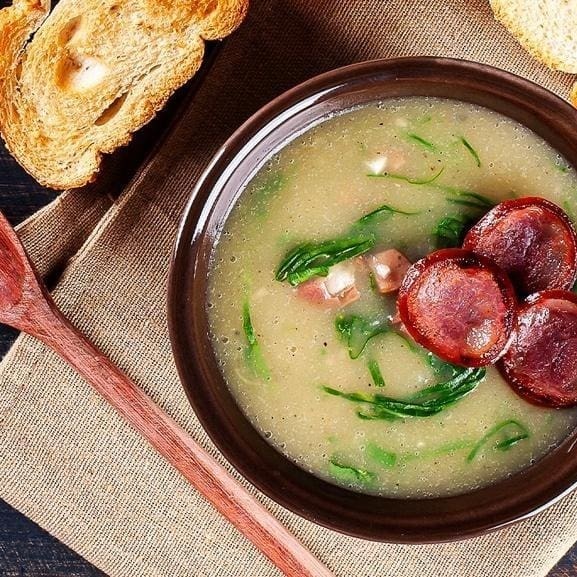 Creme de Ervilhas com Cubos de linguíça Calabresa. Acompanha Croutons.