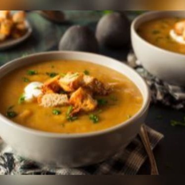 Creme de Mandioquinha com cubos de linguíça Calabresa. Acompanha Croutons.