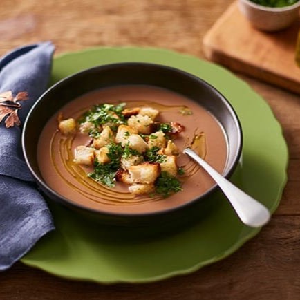 Sopa de feijão batido com cubos de Linguíça Calabresa. Acompanha Croutons.