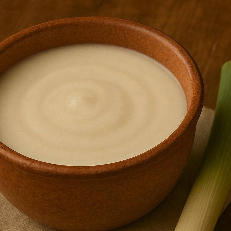 Leve e aromático: feito com alho-poró, batata e cebola refogados no azeite, com toque de noz-moscada e finalização cremosa com creme de leite.